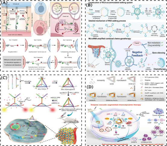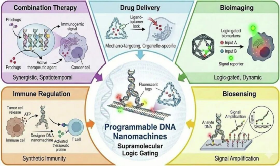 综述将DNA纳米机器突破性进展归纳为五大战略前沿:在精准递药方面,实现机械靶向与细胞器精准定位;在生物成像方面,推动从静态对比成像向动态计算显微成像升级;在生物传感方面,建立复杂基质中逻辑门控信号放大新体系;在免疫调节方面,探索合成免疫与可编程疫苗新策略;在联合治疗方面,构建多药协同的时空精准递送方案。综述明确提出,时空精准编排是突破耐药性与免疫耐受、提升治疗效果的核心关键。