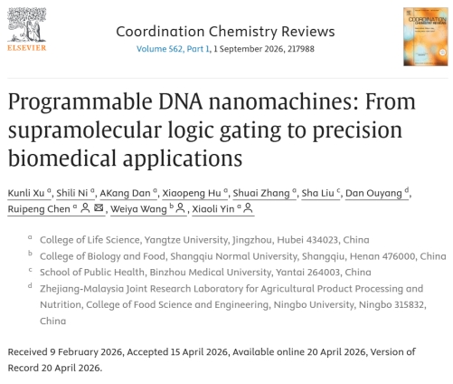 4月20日,生命科学学院陈瑞鹏教授课题组在国际顶级期刊《Coordination Chemistry Reviews》(Q1,IF=23.5)发表题为“Programmable DNA Nanomachines: From Supramolecular Logic Gating to Precision Biomedical Applications”的综述性论文,系统总结了DNA纳米机器领域的前沿进展与转化路径,为精准医疗与智能生物医学装备发展提供了重要理论支撑。生命科学学院陈瑞鹏教授、商丘师范学院王伟亚副教授、生命科学学院尹小丽教授为论文共同通讯作者。