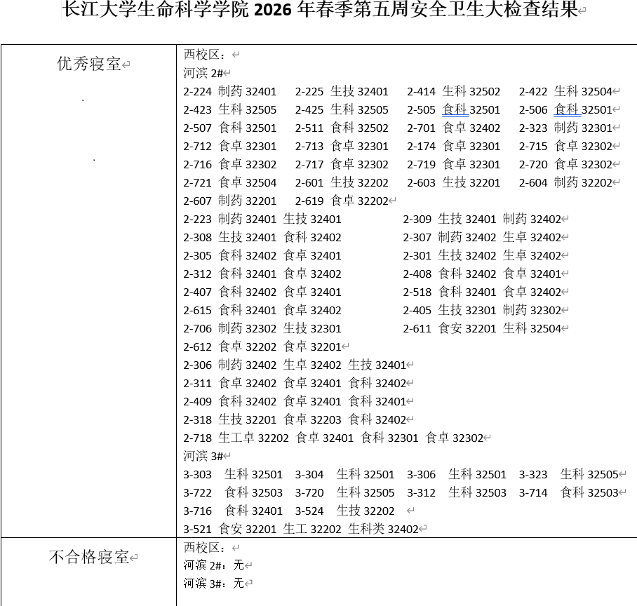 生命科学学院2026年春季学期第五周卫生大检查结果汇总