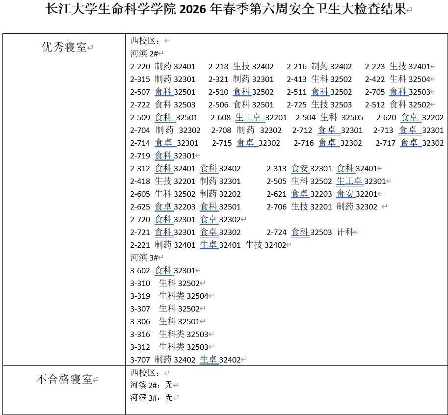 长江大学生命科学学院2026年春季第六周安全卫生大检查结果汇总.docx